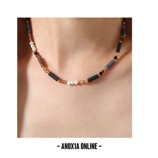 Modern and Elegant Titanium Steel Necklace with Natural Stone and Freshwater Pearls